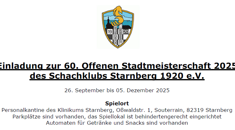 Der Schachklub Starnberg feierte 2020 sein 100-jähriges Bestehen. Die damalige Corona-Pandemie verhinderte leider das geplante Jahrhundertturnier. Dies haben wir am 24./25. Mai 2025 zum 105-jährigen Jubiläum nachgeholt.