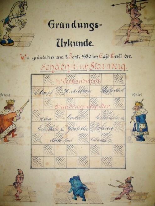 Dr. Emanuel Lasker, der bislang einzige deutsche Schachweltmeister, sagte einmal: „Schach ist vor allem ein Kampf!“ Er hätte genauso sagen können, dass auch der Aufbau und die Erhaltung eines Schachklubs einen konstanten Kampf darstellen – besonders wenn dieser im Nachgang einer der erbittertsten Kämpfe der Geschichte, dem 1. Weltkrieg (1914-1918), gegründet wird. Lasker selbst war noch Weltmeister – er sollte seinen Titel im kommenden Jahr an den Kubaner Jose Raul Capablanca verlieren – als sich am 01.09.1920 im Starnberger Café Groll elf leidenschaftliche Schachspieler zur Gründung des ersten Schachvereins in der Stadt einfanden. Eine „Organisation zur Pflege und Förderung des Schachspiels“ wollten sie schaffen, eine über 100 Jahre alte Starnberger Institution sollte es werden.