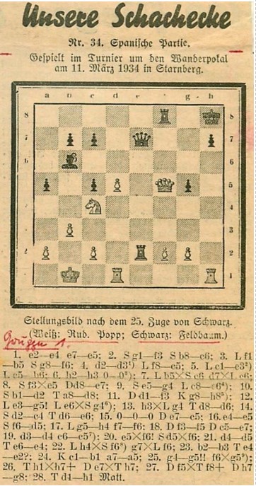 Auch die Lokalpresse berichtete über den Turnierverlauf des Starnberger Wanderpokals – hier wurde die Partie von Turniersieger Rudolf Popp gegen Herrn Feldbaum in der Spanischen Eröffnung vom 11.03.1934 abgedruckt. Interessanterweise kam bereits dort die heute noch auf Großmeister-Ebene hochaktuelle Berliner Verteidigung aufs Brett (Bildquelle: Archiv SK Starnberg)
