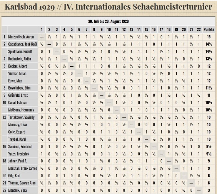 Simultanveranstaltungen in Tutzing & Starnberg als gute Turniervorbereitung? Beim anschließenden Internationalen Schachmeisterturnier in Karlsbad 1929 belegte Rudolf Spielmann einen exzellenten geteilten 2. Platz (Bildquelle: https://nimzowitsch.net/karlsbad-1929.html)