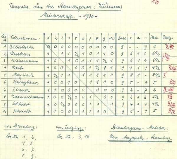 Erste und für lange Zeit die einzige gemeinsame Veranstaltung der Schachspieler aus Starnberg und Tutzing: die „Starnbergersee (Würmsee) Meisterschaft“ im Jahr 1930 mit dem souveränen Sieger Gustav Meyrink (Bildquelle: Archiv SK Starnberg / Handschriftliche Aufzeichnungen von Christian Gerstetter).