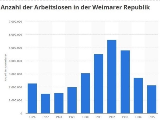 Drastischer Anstieg der Arbeitslosigkeit im Deutschen Reich seit dem Ausbruch der Weltwirtschaftskrise im Oktober 1929, die ihren Höchststand im Jahr 1932 erreichte (Bildquelle: https://de.statista.com).