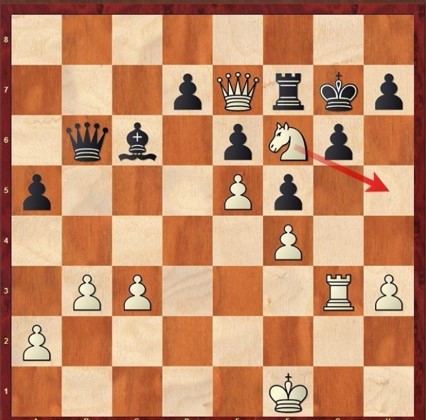 In dieser Stellung gewann Meyrink mit der forcierten Abwicklung 1. Sh5+! Kg8 (1. … Kh6 2. Dg5#) 2. De8+ Tf8 3. Txg6+! hxg6 4. Dxg6+ Kh8 5. Dg7# (Bild-/Textquelle: Helmut Pfleger, ZEITmagazin Nr. 22/2019).