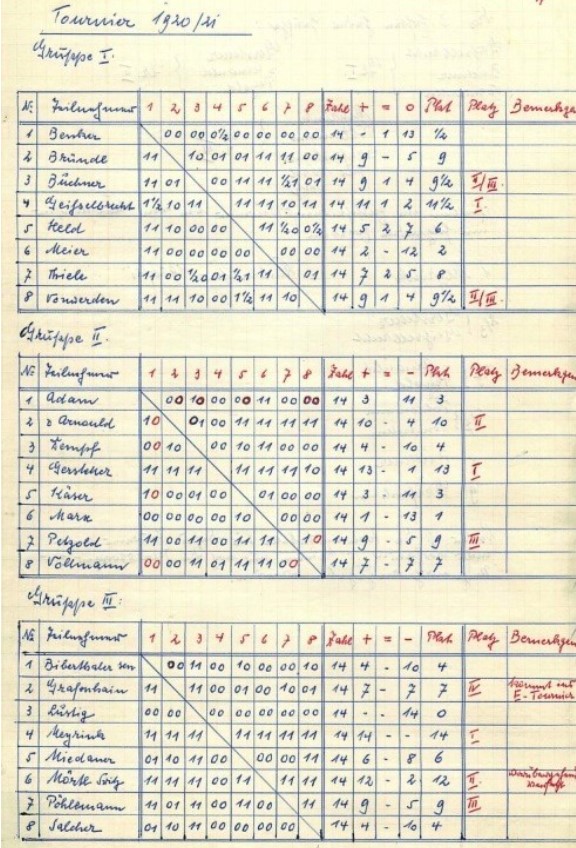 Die Tabellen der Vorrunden der ersten Starnberger Vereinsmeisterschaft: die drei bestplatzierten Spieler einer Gruppe qualifizierten sich für die Endrunde (Bildquelle: Archiv SK Starnberg / Handschriftliche Aufzeichnungen von Christian Gerstetter).
