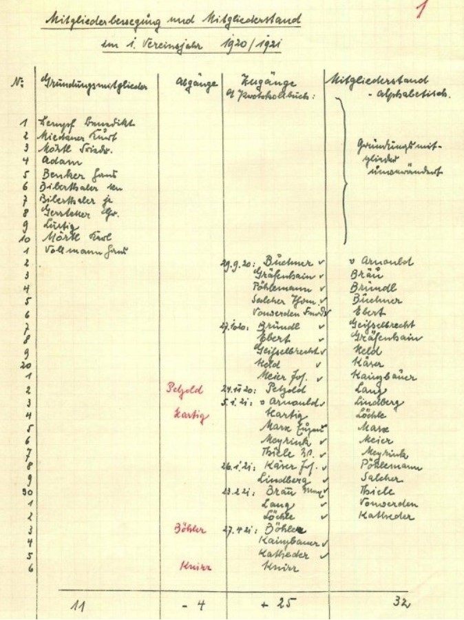 Stolze 25 neue Mitglieder – davon fast die Hälfte noch im Gründungsjahr 1920 – und nur vier Abgänge verzeichnete der SK Starnberg in seiner Premierensaison (Bildquelle: Archiv SK Starnberg / Handschriftliche Aufzeichnungen von Christian Gerstetter).