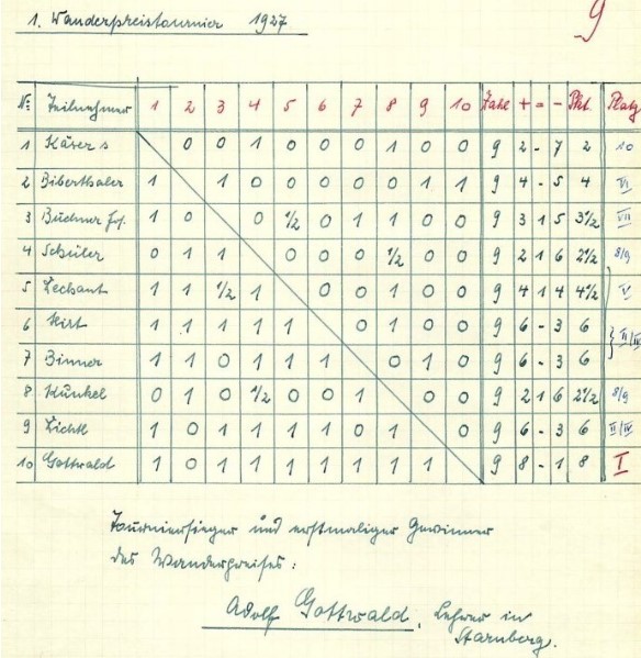 Abschlusstabelle zum 1. Starnberger Wanderpokal-Turnier im Jahr 1927 mit dem Sieger Adolf Gottwald (Bildquelle: Archiv SK Starnberg / Handschriftliche Aufzeichnungen von Christian Gerstetter).