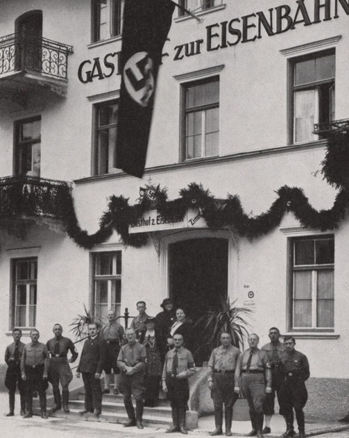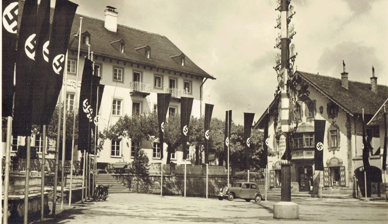 Starnberg während des NSDP-Kreistages 1938: meterhohe Fahnenmasten wie hier vor dem ehemaligen Spiellokal des SK Starnberg, dem „Tutzinger Hof“ (links). Auf Wunsch von Bürgermeister Buchner sollte beim Kreistag auch die Pflege des Schachspiels zum Vorschein kommen (Bildquelle: Stadtarchiv Starnberg/Bestand Wörsching).