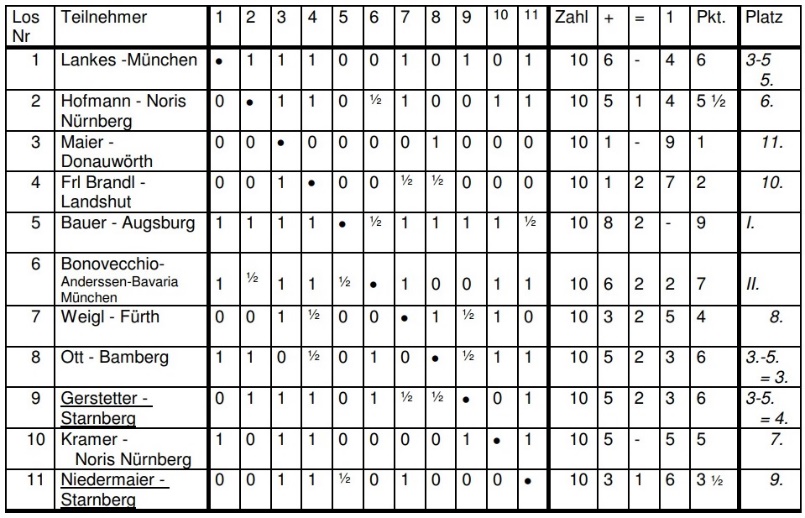 Schlusstabelle des Hauptturniers des 17. Bayerisches Schachkongresses mit den Starnberger Teilnehmern Christian Gerstetter (Platz 3-5) und dem neuntplatzierten Max Niedermaier (Bildquelle: Archiv SK Starnberg).