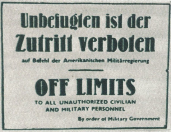 Mit einem solchen Schild sperrte die US-Militärregierung am 30.04.1945 den „Gasthof zur Eisenbahn“ ab. Die Starnberger Schachspieler konnten damit nicht mehr auf Ihr Spielmaterial zugreifen (Bildquelle: Starnberger Stadtgeschichte „Politische Geschichte“, Band 10/2).