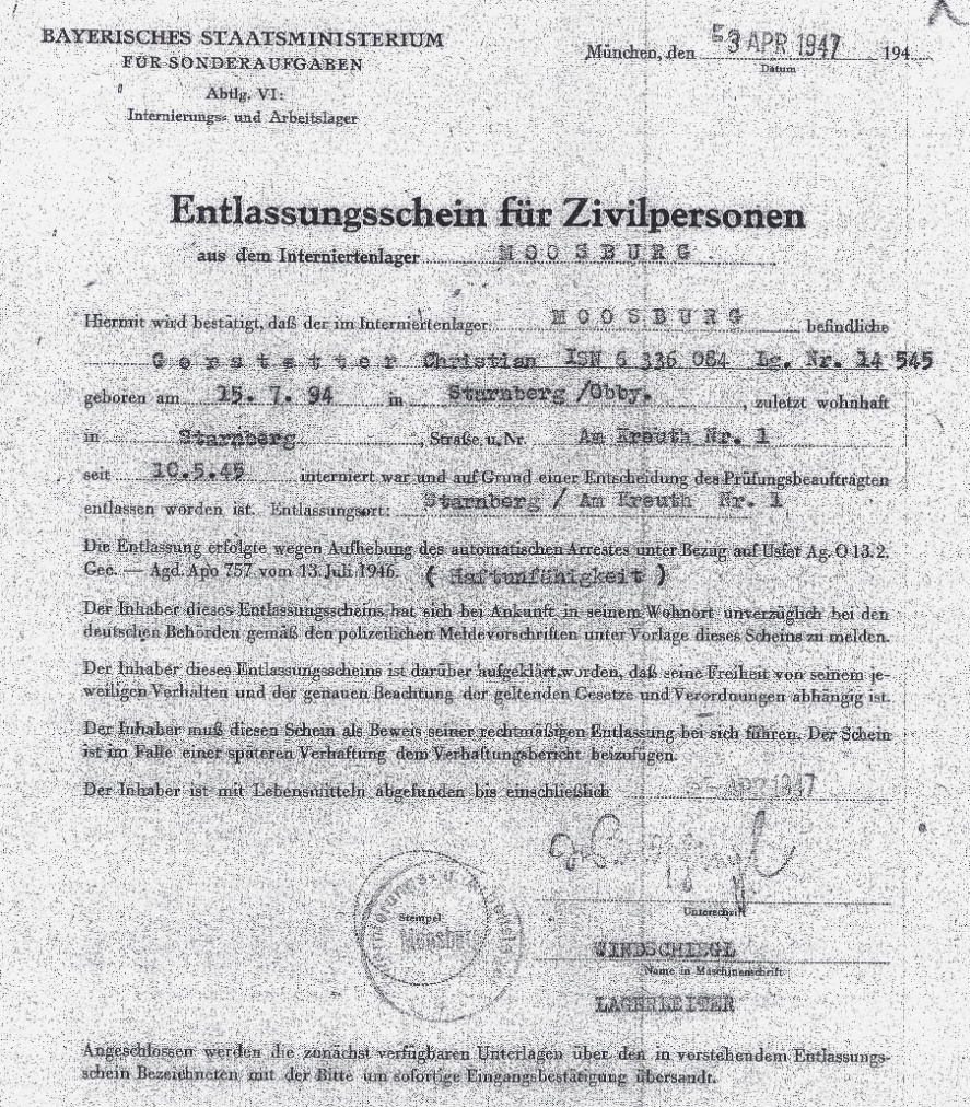 Im Internierungslager Moosburg verbrachte Vereinsleiter Gerstetter die letzten Monate seines „Automaischen Arrests“, bevor er am 3.04.1947 nach Starnberg zurückkehren durfte (Bildquelle oben: Moosburger Zeitung vom 14.07.2012, Bildquelle unten: Staatsarchiv München, Spruchkammerakt K 4576 Gerstetter Christian).