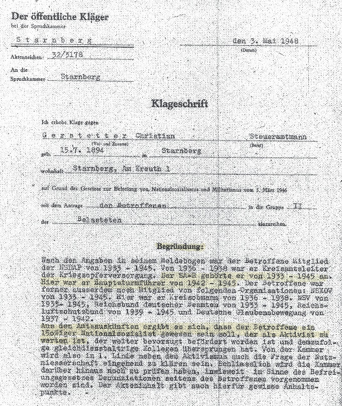 Das Strafverfahren gegen Gerstetter vor der Spruchkammer Starnberg begann am 3.05.1948. Der öffentliche Kläger des Gerichts forderte dabei, Gerstetter – wie später seinen ehemaligen Klubkollegen Buchner – als „Belasteten“ in Kategorie II einzustufen. Laut der Anklageschrift soll Gerstetter ein „150%iger Nationalsozialist“ gewesen sein und ein so genannter Aktivist. Zumindest von seiner Ämterfülle ließ sich letzterer Vorwurf einfach belegen. Denn Gerstetter, der von 1933 bis 1945 NSDAP-Parteimitglied war, gehörte nicht weniger als sechs NS-Organisationen an. Er war tätig in der SA-Reserve (1933-1945, von 1942 bis 1945 als Hauptsturmführer), der NSKOV (1933-1945, von 1936 bis 1938 als Kreisobmann), der NSV (1933-1945), dem Reichsbund deutscher Beamten (1933-1945), der Deutschen Glaubensbewegung (1937-1942) und dem Reichsluftschutzbund (1937-1942). Daneben fungierte er von 1936-1938 als Kreisamtsleiter der Kriegsopferversorgung.