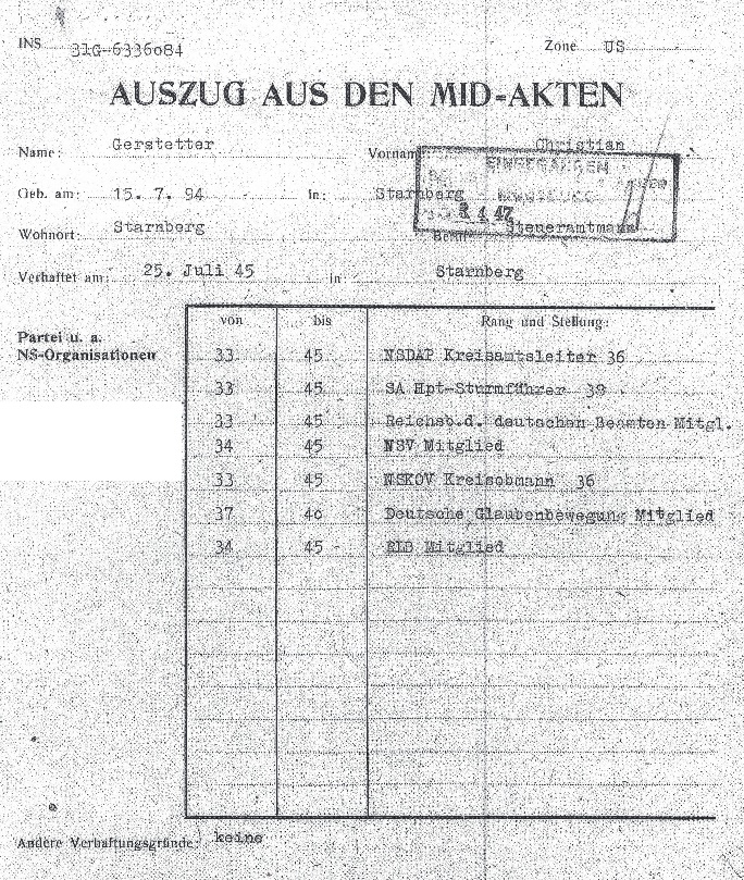 Gerstetter, dessen Rechtsanwalt Dr. Peter Burnhauser für eine Einstufung seines Mandanten als „Mitläufer“ in Kategorie IV plädierte, erklärte seinen Parteieintritt im Jahr 1933 mit dem Druck, der von der NSDAP nach der Machtübernahme auf Beamte ausgeübt worden sei. Er arbeitete zum damaligen Zeitpunkt als Steuerinspektor beim Finanzamt Starnberg. Bis Kriegsende erhielt er zweimal eine Beförderung, bevor er im Juni 1945 als Steueramtmann entlassen wurde. Der Schachklub-Vereinsleiter machte für seine Parteiunterstützung zudem seine „völlige politische Unerfahrenheit“ geltend, so dass er „nicht wissen oder ahnen konnte“, dass die NSDAP eine Gewaltherrschaft anstrebte. Der Starnberger Stadtrat hatte Gerstetter diese Version in einer Beurteilung vom 10.04.1947 jedoch nicht abgenommen. Der Behörde zufolge war er nicht unwissend und hielt den Krieg vielmehr „für richtig und recht“.