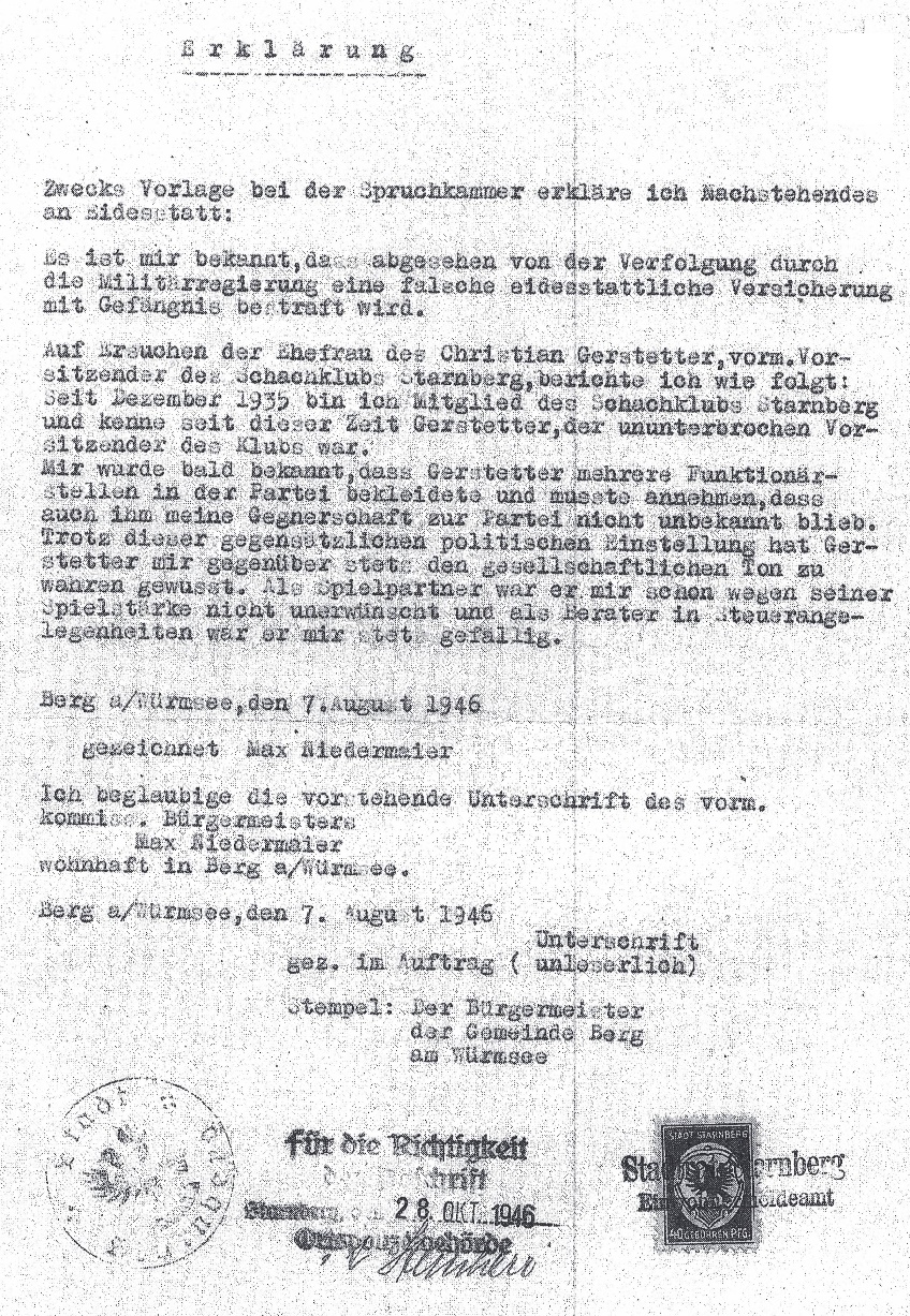 Zahlreiche Mitarbeiter des Finanzamtes, frühere Parteikollegen und Nachbarn gaben jedoch für Gerstetter entlastende Erklärungen ab, so genannte Persilscheine. Zumindest bei einigen Erklärungen liegt allerdings der Verdacht nahe, dass es sich um Gefälligkeitsschreiben handelte. Gerstetter formulierte dabei den Text dieser Schreiben und sendete sie an ihm wohl gesonnene Personen mit der Bitte um Abgabe. Auch Max Niedermaier, SPD-Mitglied und Gerstetters langjähriger Klubkollege beim SK Starnberg, erhielt im Januar 1946 ein solches Schreiben. Er weigerte sich jedoch, den gewünschten Persilschein zu erstellen. Stattdessen gab er am 7 08.1946 eine neutral formulierte Erklärung zum Schachklub-Vereinsleiter ab.