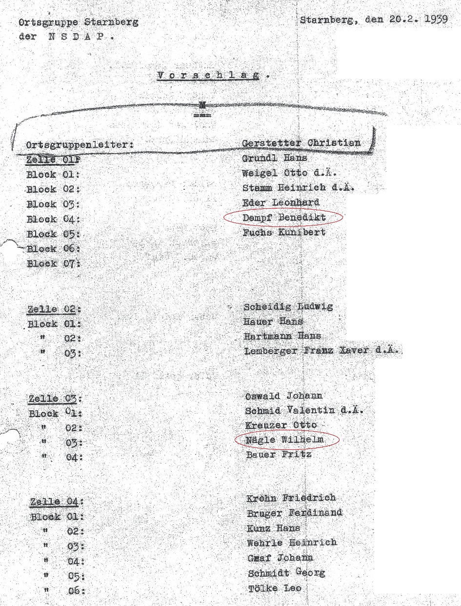 “Vorschlag“ einer personellen Strukturierung der NSDAP-Ortsgruppe Starnberg vom 20.02.1939. Darin integriert: Schachklub-Vereinsleiter Gerstetter (der jedoch kein Ortsgruppenleiter werden sollte), SC-Gründungsmitglied Benedikt Dempf und der spätere SC-Schachwart Wilhelm Nägle (Bildquelle: Staatsarchiv München, Spruchkammerakte K 4576 Gerstetter Christian).