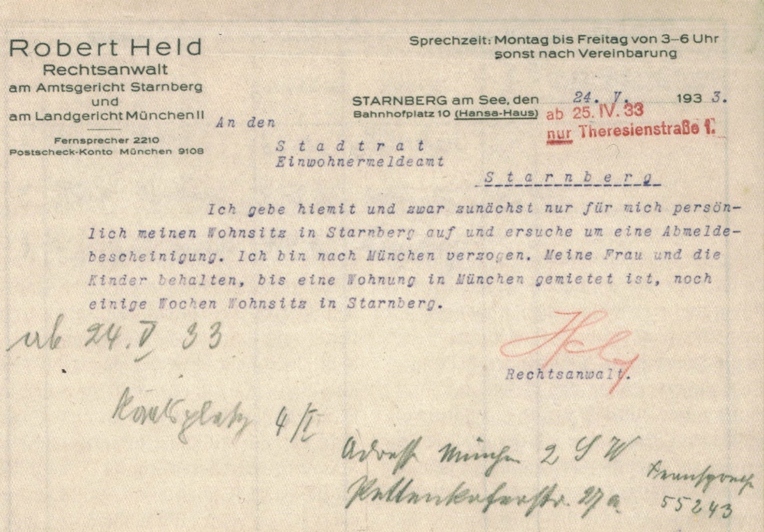 Held sah sich genötigt, Starnberg zu verlassen und seine Anwaltspraxis nach München zu verlegen. Seit 1928 besaß er auch eine Zulassung beim Landgericht München II. Doch auch hier war er vor dem langen Arm der Starnberger NSDAP-Gruppe nicht sicher. Diese legte der gleichgeschalteten Münchener Rechtsanwaltskammer nahe, für den Entzug von Helds Zulassung zu sorgen. Als Mittel zum Zweck sollte das am 7. März 1933 von der NSDAP-Bundespartei erlassene „Gesetz zur Wiederherstellung des Berufsbeamtentums“ dienen. Das Gesetz erlaubte den Leitern öffentlicher Institutionen, jüdische und politisch unerwünschte Beamte sowie Personen, die „Berufe mit öffentlich-rechtlicher Wirksamkeit“ ausübten wie Anwälte und Notare, Berufsverbot zu erteilen. Die Rechtsanwaltskammer versuchte daraufhin den damaligen bayerischen Justizminister Dr. Hans Michael Frank, der später im so genannten „Nürnberger Prozess gegen die Hauptkriegsverbrecher“ zum Tode verurteilt werden sollte, für ihr Anliegen zu gewinnen.