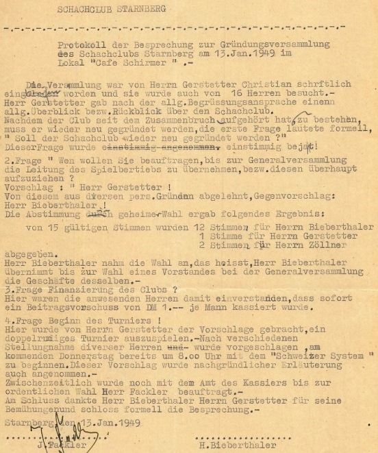 Es dauerte nicht lange, da war der frühere Vereinschef wieder in seinem Element. Noch bevor das geplante Turnier begann, schlug er den Schachfreunden des „Weinhaus Schirmer“ ein Treffen am 13.01.1949 vor. Zentrales Thema der Zusammenkunft: die Neugründung des SK Starnberg! Insgesamt 15 gründungswillige Schachenthusiasten folgten Gerstetters Aufruf und nahmen an der Besprechung teil. Sie stimmten einstimmig dafür, den alten Verein wieder aufleben zu lassen. Die Neugründung sollte in einer Generalversammlung am 31.03.1949 vollzogen werden. Mit der Vorbereitung der Versammlung wurde Georg Biberthaler betraut, der bei dem Treffen zum Interim-Geschäftsführer gewählt wurde. Zwar hätten die Schachfreunde am liebsten Gerstetter auf diesem Posten gesehen, der lehnte aus persönlichen Gründen aber ab. Er erklärte sich jedoch bereit, das anstehende Turnier zu leiten. Es sollte bereits am 20.02.1949 beginnen und über zehn Runden nach Schweizer System gespielt werden. Der Turniersieger sollte den Klubmeistertitel erhalten, sofern er dem neu gegründeten Verein beitrete.