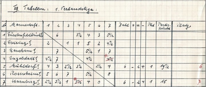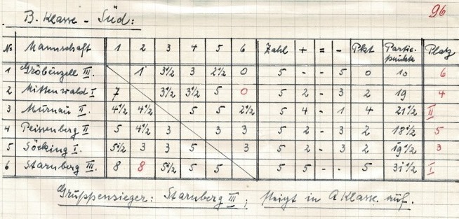 Nur zwei Mannschafts- und 15 Brettpunkte aus sechs Begegnungen: Starnbergs „Erste“ musste als Schlusslicht der Verbandsliga die Rückkehr in die A-Klasse antreten (Bildquelle: Archiv SK Starnberg / Handschriftliche Aufzeichnungen von Christian Gerstetter).