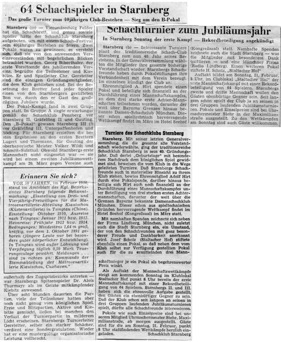Obwohl die Starnberger Auswahl das Jubiläums-Pokalturnier im Hotel „Seehof“ nicht gewinnen konnte, war die regionale Presse voll des Lobes für die Veranstaltung. In einem Artikel des Starnberger „Land- und Seebote“ vom 26.03.1960 wurde sie als „Markstein in Starnbergs Schachgeschichte“ bezeichnet.