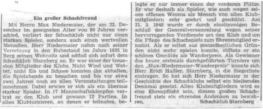 Nachruf auf Ehrenmitglied und Stifter des nach ihm benannten Wanderpokals: Max Niedermaier (Bildquelle: Archiv SK Starnberg).