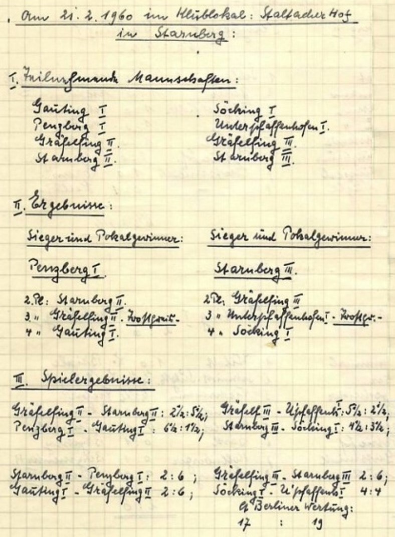 Dramatik bis zum Schluss: Gräfelfing gewann nach Partienabschätzung und Berliner Wertung das Finale des Pokalturnieres, während sich Starnberg den Trostpreis sicherte (Bildquellen: Archiv SK Starnberg / Handschriftliche Aufzeichnungen von Christian Gerstetter).