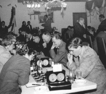 Auch an den mittleren Brettern wurde hart gerungen, doch sowohl Paul Cornel (Brett 3, im Hintergrund ganz links) als auch die neben ihm sitzenden Dieter Srocke (4) und USA-Rückkehrer Erich Haßler (5) mussten sich mit Remisen begnügen (Bildquelle: Archiv SK Starnberg).