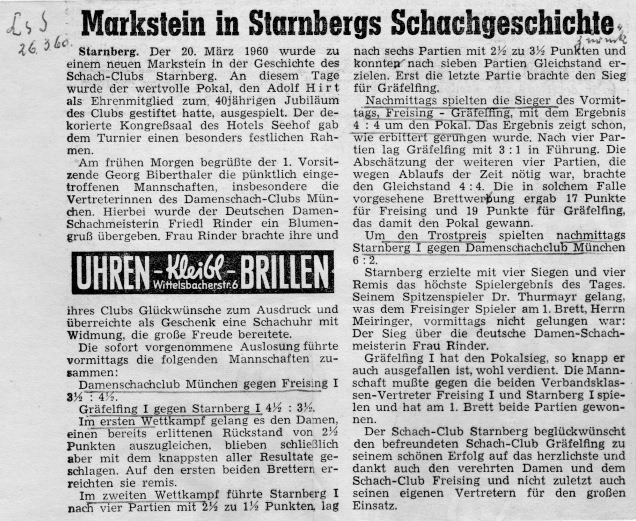 Eine bessere Berichterstattung zum Hauptturnier seiner 40-Jahr-Feier hätte sich der SK Starnberg wohl kaum wünschen können: ein ebenso ausführlicher wie wohlgesonnener Artikel im Starnberger „Land- und Seebote“ vom 26.03.1960 (Bildquelle: Archiv SK Starnberg).