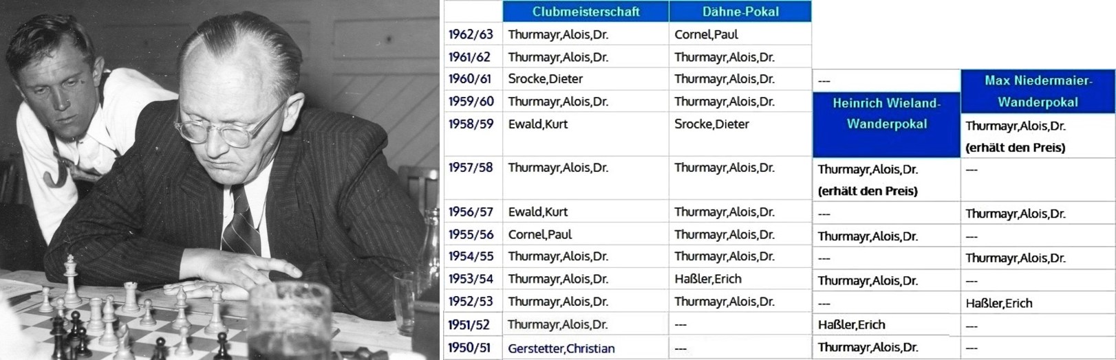 Der Sieg bei der ersten Auflage des Dähne-Pokals auf Klubebene ging an Dr. Alois Thurmayr. Er gewann die vereinsinterne Ausscheidung für das Pokalturnier bis zur Saison 1961/62 noch sieben weitere Male und war damit seinerzeit der mit Abstand erfolgreichste SC-Akteur bei diesem Wettbewerb. Überhaupt dominierte Thurmayr die Starnberger Klubturniere von Anfang der 50er-Jahre bis Mitte der 60er-Jahre in erstaunlicher Manier. In der Spielzeit 1957/58 gewann er das „Heinrich Wieland-Wanderpreistournier“ zum vierten Mal. Damit durfte er das von Wieland gestiftete Likör-Service ebenso mit nach Hause nehmen wie ein Jahr später den von Max Niedermaier gespendeten Wanderpokal, den er zum dritten Mal gewann. Womöglich Thurmayrs größte Errungenschaften waren aber seine acht Titelgewinne bei der Starnberger Klubmeisterschaft, die er zwischen den Spielzeiten 1951/52 und 1962/63 einheimste. Er brachte damit das Kunststück fertig, die über Jahrzehnte andauernde Siegesserie von Christian Gerstetter (14 Titelgewinne) bei diesem Wettbewerb zu beenden.