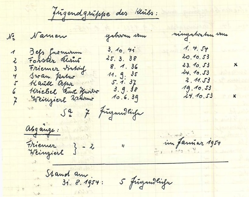 Ein Anfang war gemacht: mit sieben Jugendlichen startete am 1.10.1953 die erste „Jugendgruppe“ des SK Starnberg, zum Ende der Saison 1953/54 zählte die Sparte noch fünf junge Mitglieder (Bildquelle: Archiv SK Starnberg / Handschriftliche Aufzeichnungen von Christian Gerstetter).