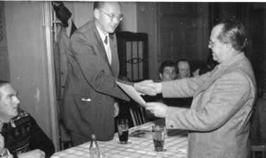 Das neue Spiellokal sollte dem Verein in der Spielzeit 1958/59 viel Glück bringen – und eine Reihe wichtiger Heimsiege. Zu Saisonbeginn mussten die Mitglieder aber eine traurige Nachricht verkraften: Theo Gastel, der in der Saison 1929/30 beigetreten war, starb am 17.10.1958. Gastel übte bereits kurz nach seinem Eintritt von Oktober 1930 bis Oktober 1931 das Amt des Schachwartes im damaligen Vorstand aus. Er hielt dem Verein im Anschluss trotz widrigster Umstände über Jahrzehnte die Treue. Während seines Wehrmacht-Einsatzes im 2. Weltkrieg schrieb er mehrmals Briefe an die Vereinsführung. Unter anderem berichtete er am 22.01.1944 über seinen Abbruch-Sieg gegen den zweimaligen WM-Herausforderer Efim Bogoljubow, der wenige Wochen zuvor eine Simultanvorstellung beim Reserve-Lazarett im polnischen Zamosc gegeben hatte (siehe Kapitel 2).
