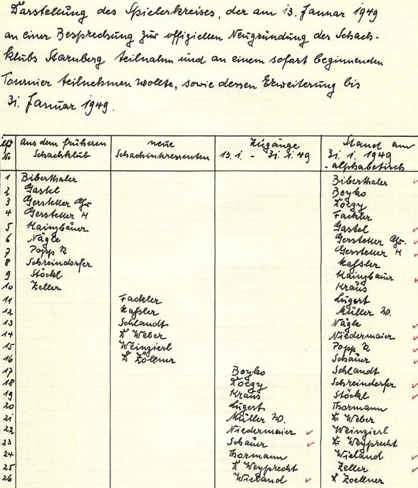 Mit seinen 30 Anhängern, die zum Zeitpunkt der Generalversammlung als Mitglieder registriert waren, besaß der Verein dennoch genug Akteure um wieder Mannschaftskämpfe bestreiten zu können. Daher meldete der damalige Interims-Geschäftsführer Georg Biberthaler den SK Starnberg bereits am 20.01.1949 beim Oberbayerischen Schachbund für den Spielbetrieb an. Obwohl der Klub in dem Jahr noch an keinen Bezirks- oder Verbandskämpfen teilnahm, war er dennoch wieder auf der schachlichen Landkarte vertreten!