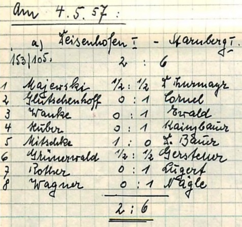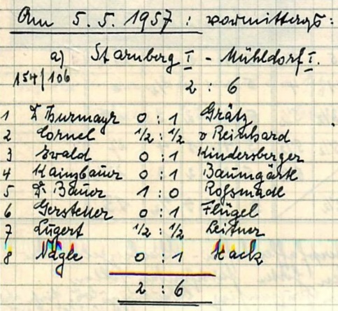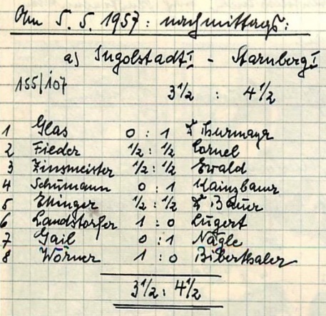 Zwei Siege, eine Niederlage: die Bilanz der Starnberger „Ersten“ gegen Oberbayern beste Schachteams vom 04./05.05.1957 in der Sportschule Grünwald konnte sich durchaus sehen lassen (Bildquelle: Archiv SK Starnberg / Handschriftliche Aufzeichnungen von Christian Gerstetter).