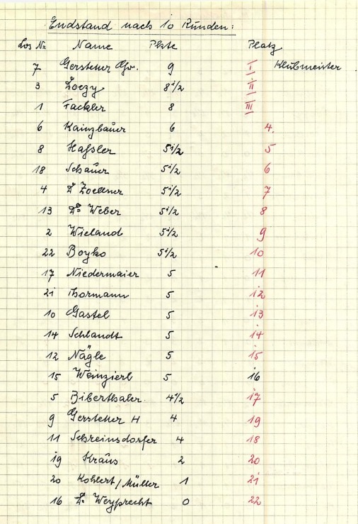 Schlusstabelle der unglücklich verlaufenen Klubmeisterschaft 1949/50 mit 37 Nullungen und einem Todesfall (Bildquelle: Archiv SK Starnberg / Handschriftliche Aufzeichnungen von Christian Gerstetter).