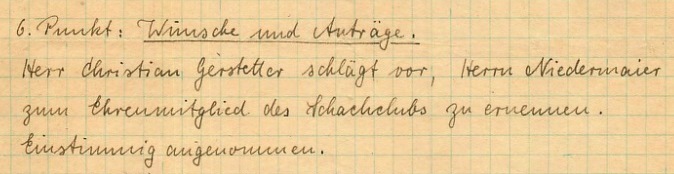 Niedermaier selbst wurde bei der Generalversammlung zum Ehrenmitglied ernannt. Die Vereinsmitglieder honorierten damit nicht nur sein selbstloses Eindringen in den besetzten „Gasthof zur Eisenbahn“. Sie zollten ihm gleichzeitig Respekt für seine bis dato 15-jährige Mitgliedschaft und die aktive Teilnahme am Klubleben trotz der weiten Entfernung zwischen Niedermaiers Wohnung in Oberberg und den Starnberger Spiellokalen.