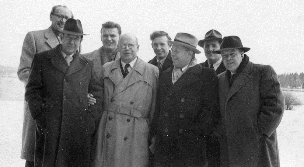 Gewannen für Starnberg 1951/52 erstmals den Zugspitz-Mannschaftsmeistertitel (v.l.n.r.): Dr. Alois Thurmayr, Prof. Herrmann Schlandt, Erich Haßler, Christian Gerstetter, Helmut Gebhard, Georg Biberthaler, Rudolf Lugert und Wilhelm Nägle (Bildquelle: Archiv SK Starnberg / Aufnahme stammt vom 20.03.1955 nach einem 5:3-Auswärtserfolg in Penzberg).