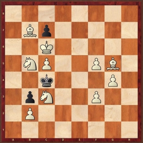 Schachproblem von Theo Gastel zum 30. Geburtstag des SK Starnberg im Jahr 1950 – eine mögliche Lösung: 1. La6 Kd3 2. Sa3+ Kd4 3. Se2+ Ke5 4. Sd4# oder 1. … Kb4 2. Sxc7 Ka5 3. Ld8 Kb4 4. S7d5#