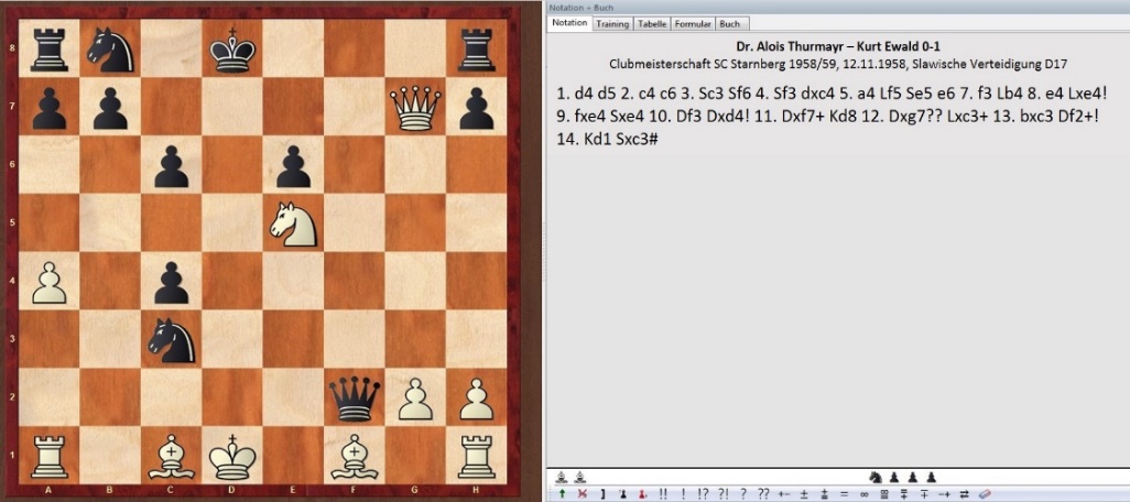 Verstarb mit Theo Gastel ein Schachproblem-Komponist des Vereins, so sollte mit Kurt Ewald schon bald ein anderes Mitglied in seine Fußstapfen treten. Doch bevor Ewald Anfang der 60er-Jahre seine äußerst ertragreiche Tätigkeit als Ersteller von Schachproblemen startete, gelang ihm bei der Klubmeisterschaft 1958/59 ein besonderer Coup. Nicht nur gewann der 27-jährige Stammspieler der ersten Mannschaft nach seinem Premieren-Titel in der Saison 1956/57 zum zweiten Mal Starnbergs wichtigstes Vereinsturnier. Er setzte sich zudem gleich zweimal gegen Titelverteidiger Dr. Alois Thurmayr durch. Furios war besonders sein erster Sieg gegen den dominierenden Vereinsspieler der 50er-Jahre. Ewald setzte mit Schwarz in nur 14 Zügen matt!
