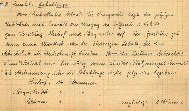 Auszug aus dem Sitzungsprotokoll der Generalversammlung des Vereins vom 31.03.1949 zum Wechsel des Spiellokals (Bildquelle: Archiv SK Starnberg / Handschriftliche Aufzeichnungen von Georg Biberthaler).
