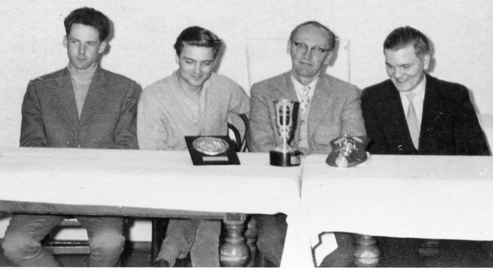 Der Bezirks-Einzelmeister von 1959, Dr. Alois Thurmayr, bei der Arbeit (Bild links) und mit einigen Turnierkollegen: Volker Wildt (ganz links, damals Gauting / später Starnberg), Thomas Margelik (2.v.l. / Garmisch) und Hans Zeitler (Peißenberg / Bildquelle: Archiv SK Starnberg).