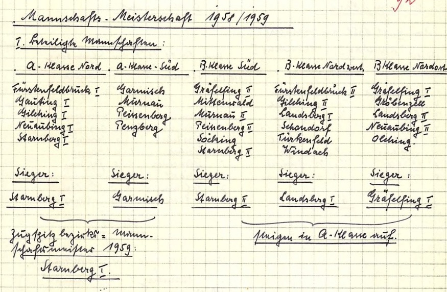 “Doppelgold“ für den SK Starnberg in der Saison 1958/59: während die 1. Mannschaft die A-Klasse Nord sowie den anschließenden Stichkampf um die Zugspitz-Bezirksmeisterschaft gewann, stieg Starnbergs „Zweite“ als Sieger der B-Klasse Süd in die A-Klasse auf (Bildquelle: Archiv SK Starnberg / Handschriftliche Aufzeichnungen von Christian Gerstetter).