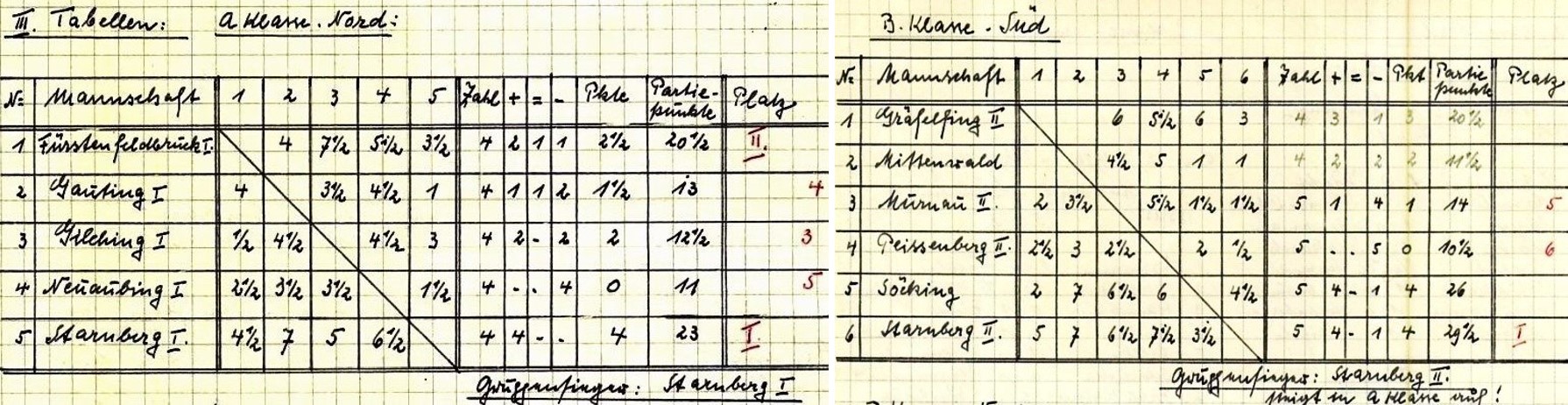 Viele Wege führen zu Platz 1: während Starnberg II dank mehrerer klar gewonnener Wettkämpfe und einer damit sehr hohen Brettpunktzahl am Ende den Spitzenrang belegte, besiegte die „Erste“ all ihre Gegner (Bildquellen: Archiv SK Starnberg / Handschriftliche Aufzeichnungen von Christian Gerstetter).