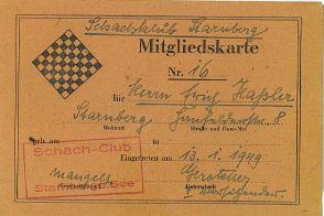 War besonders bei ehemaligen Vereinsmitgliedern weniger begehrt als erwartet: eine Mitgliedskarte für den 1949 wiedergegründeten Schachklub Starnberg, im Bild ausgestellt auf Erich Haßler (Bildquelle: Archiv SK Starnberg).