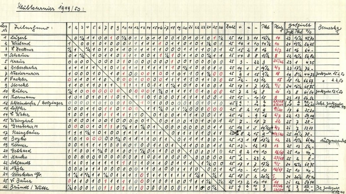 So gut es für den Verein bei seinen Mannschaftskämpfen lief, so schwierig gestaltete sich in der Saison 1949/50 die Durchführung von Turnieren. Verlief noch die vor der Neugründung gestartete Klubmeisterschaft im Jahr 1949 ohne Probleme, so hagelte es beim Folgeturnier nicht weniger als 37 Nullungen! Hauptgrund für das Desaster war der mehrheitliche Wunsch der 26 Teilnehmer, in einer einzigen Gruppe im Modus Jeder-gegen-Jeden zu spielen. Der Entschluss erinnerte an die fatale Entscheidung aus der Saison 1921/22, das damalige Klubturnier mit 24 Spielern ebenfalls im Modus Jeden-gegen-Jeden auszutragen und das Ganze doppelrundig! Das Turnier wurde seinerzeit abgebrochen (siehe Kapitel 1). Soweit kam es diesmal nicht, dennoch führten die Rücktritte von fünf Spielern zu chaotischen Zuständen. Zudem erkrankte Turnierteilnehmer und Vorstandsmitglied Alfons Schreindorfer so schwer, dass er noch während der Meisterschaft verstarb. Sieger des Unglücksturniers wurde einmal mehr Vereinsleiter Gerstetter. Er wies am Ende die meisten Punkte als auch den höchsten Gewinn-Prozentsatz aller Teilnehmer auf.