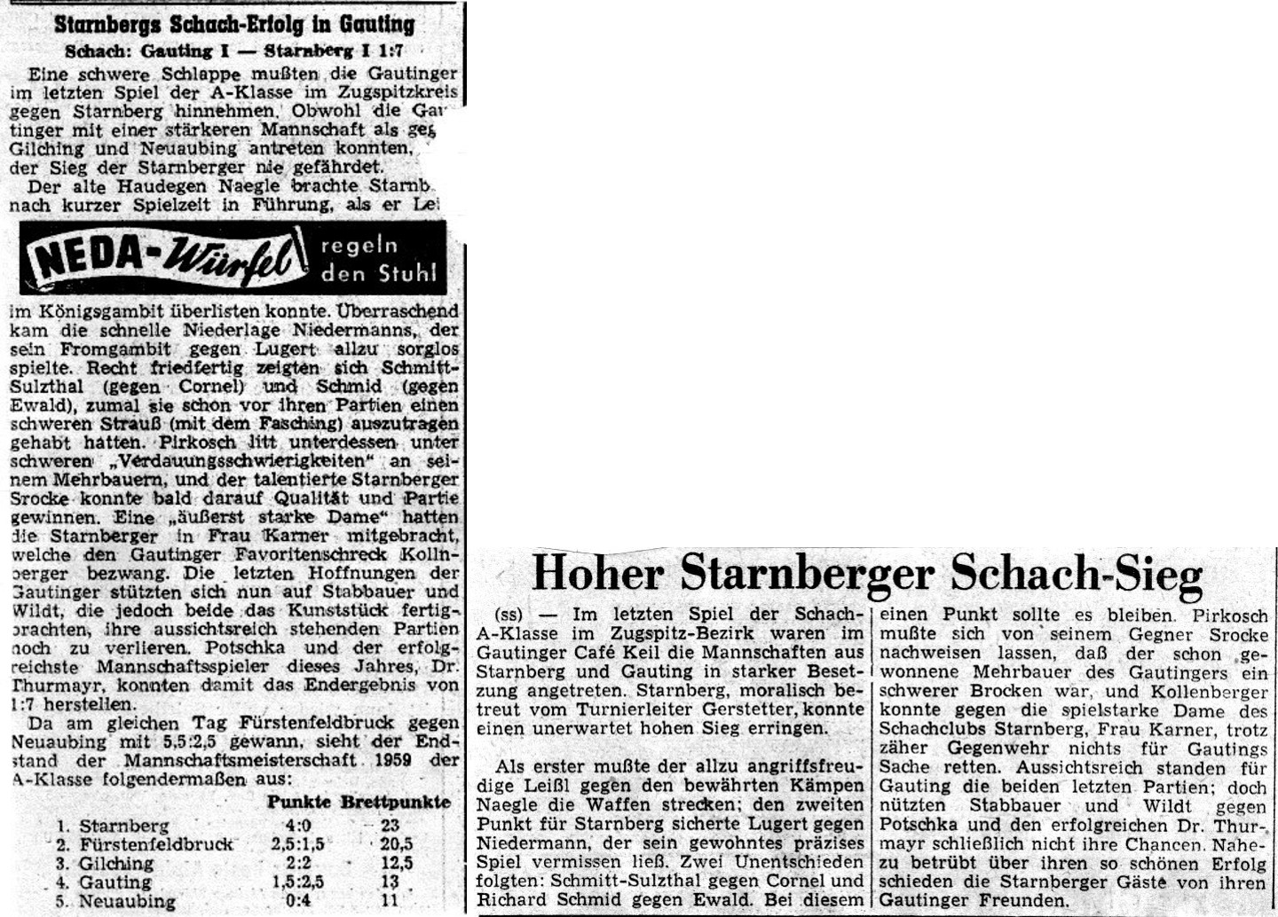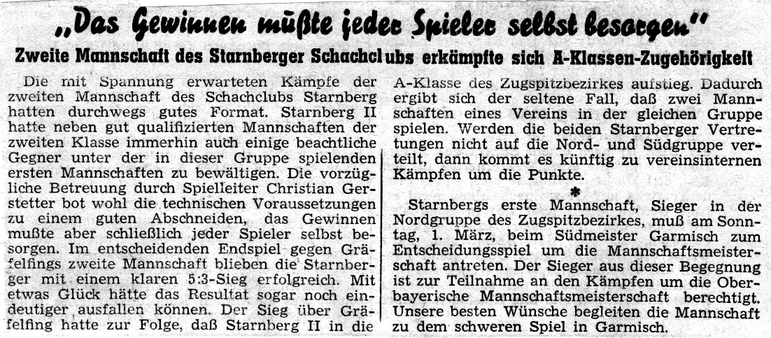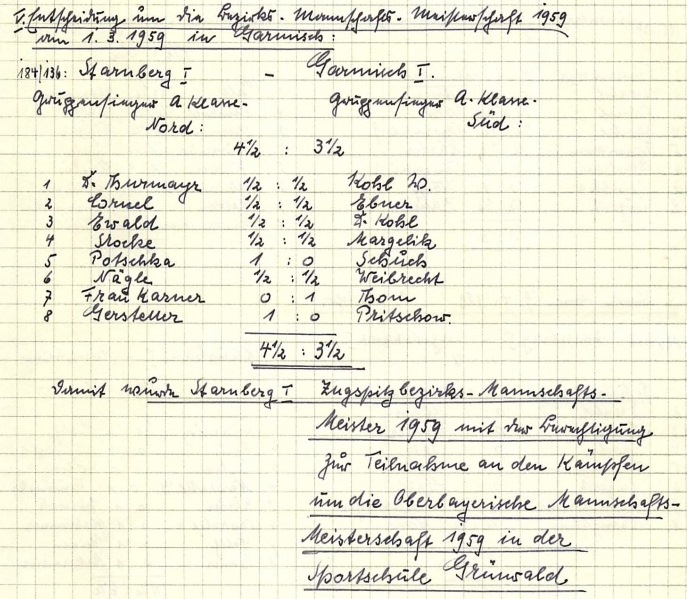 Für Starnbergs erste Mannschaft blieb jedoch nicht viel Zeit, ihren Erfolg in der A-Klasse Nord zu genießen. Bereits am 01.03.1959 stand das Duell um den Mannschaftsmeistertitel im Schachbezirk Zugspitze gegen den Sieger der A-Klasse Süd, Garmisch I, an. Dank Siegen von Rüdiger Potschka (Brett 5) und Teamkapitän Christian Gerstetter (8) reichte es am Ende zu einem 4,5:3,5-Erfolg – und die Seestädter durften erneut feiern.