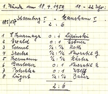 Auf dem Weg zum Sieg in der A-Klasse Nord stellte für Starnbergs 1. Mannschaft das Aufeinandertreffen mit dem späteren Tabellenzweiten Fürstenfeldbruck I am 11.01.1959 eine Schlüsselbegegnung dar. Man duellierte sich an allen Brettern heftig, doch Erfolge von Robert Fischer (Brett 8), Klubmeister Kurt Ewald (5) und Bezirks-Einzelmeister Dr. Alois Thurmayr (1) ließen das Pendel zugunsten der Seestädter ausschlagen.