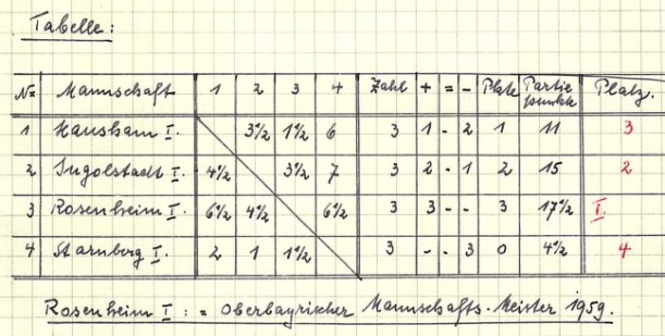 Wurde beim SK Starnberg sicher nicht eingerahmt: die Schlusstabelle der oberbayerischen Mannschaftsmeisterschaft 1959 mit der abgeschlagenen ersten Mannschaft auf Platz vier (Bildquelle: Archiv SK Starnberg / Handschriftliche Aufzeichnungen von Christian Gerstetter).