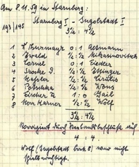 Eine perfekte Saison in mehrfacher Hinsicht: sowohl Starnbergs dritte Mannschaft als auch ihr „Topscorer“ Otto Friedl (4,0 Punkte aus vier Partien) gewannen alle Ihre Begegnungen (Bildquellen: Archiv SK Starnberg / Handschriftliche Aufzeichnungen von Christian Gerstetter).