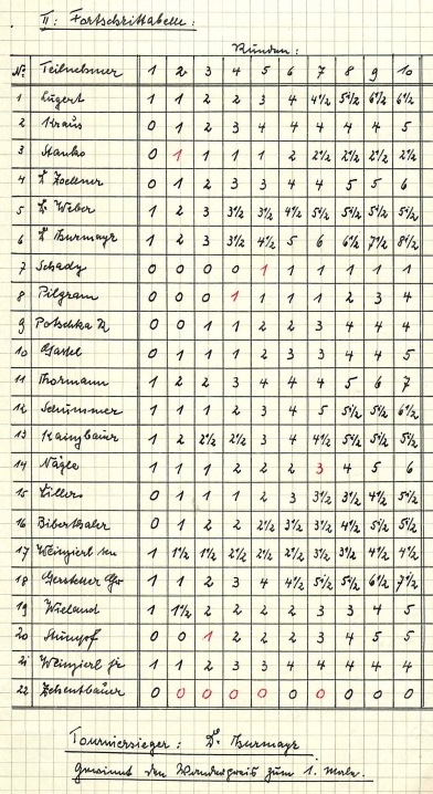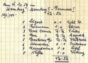 Ein neuer Pokalwettbewerb und ein neuer Sieger: Dr. Alois Thurmayr gewann die Premiere des Heinrich Wieland-Wanderpreistourniers im Jahr 1951 ungeschlagen mit 8,5 Punkten aus 10 Runden (Bildquelle: Archiv SK Starnberg / Handschriftliche Aufzeichnungen von Christian Gerstetter).