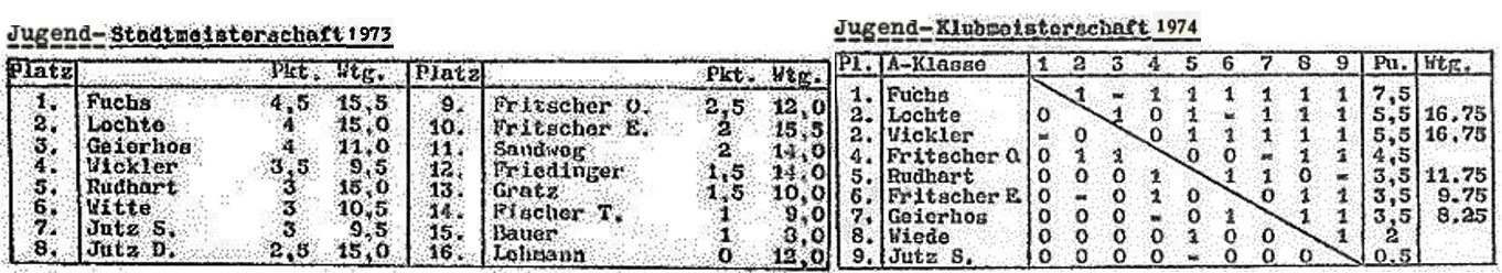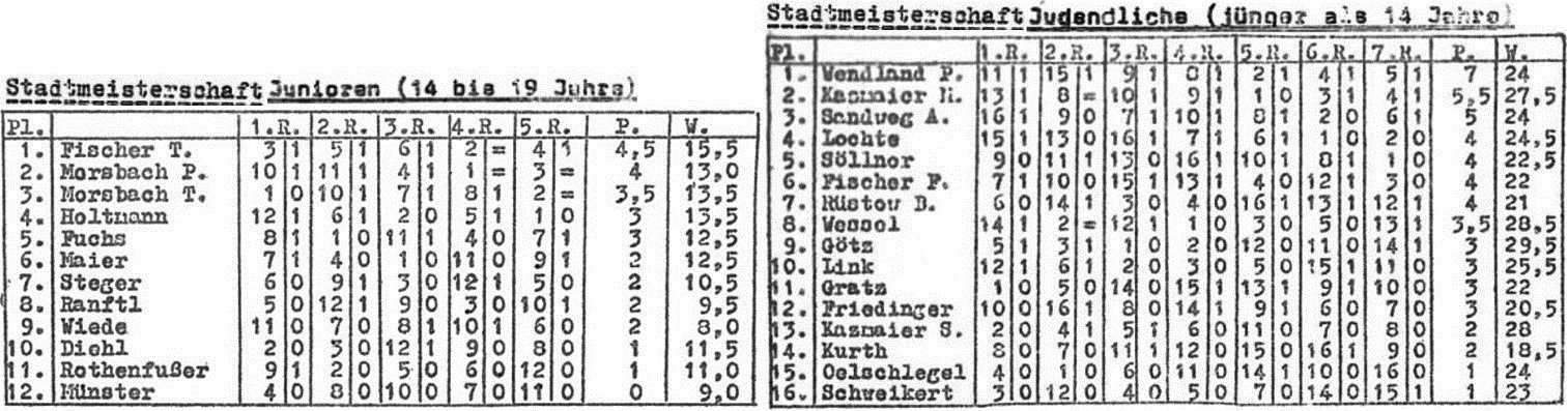 Das erste Turnier nach dem Bezug des neuen Spiellokals war auch klar – die Jugend-Stadtmeisterschaft 1971/72! Sie fand von 15.12.1971 bis 16.02.1972 mit 28 Teilnehmern statt. Damit war die Beteiligung fast so hoch wie bei dem abgebrochenen Wettbewerb. In der Spielklasse der Unter-14-Jährigen setzte sich Peter Wendland durch – Bruder des Jugend-Bezirksmeisters von 1969, Klaus Wendland. Er gewann mit dem perfekten Ergebnis von sieben Punkten aus sieben Partien. Das Turnier der älteren Jugendlichen entschied der 16-jährige Thomas Fischer mit 4,5 Punkten aus fünf Partien für sich. Mit Platz 5 musste sich hier der ebenfalls sehr talentierte Martin Fuchs (3,0 Punkte) zufriedengeben. Kurioserweise gelang ihm einige Wochen später bei der Stadtmeisterschaft der Senioren ein besseres Ergebnis.
