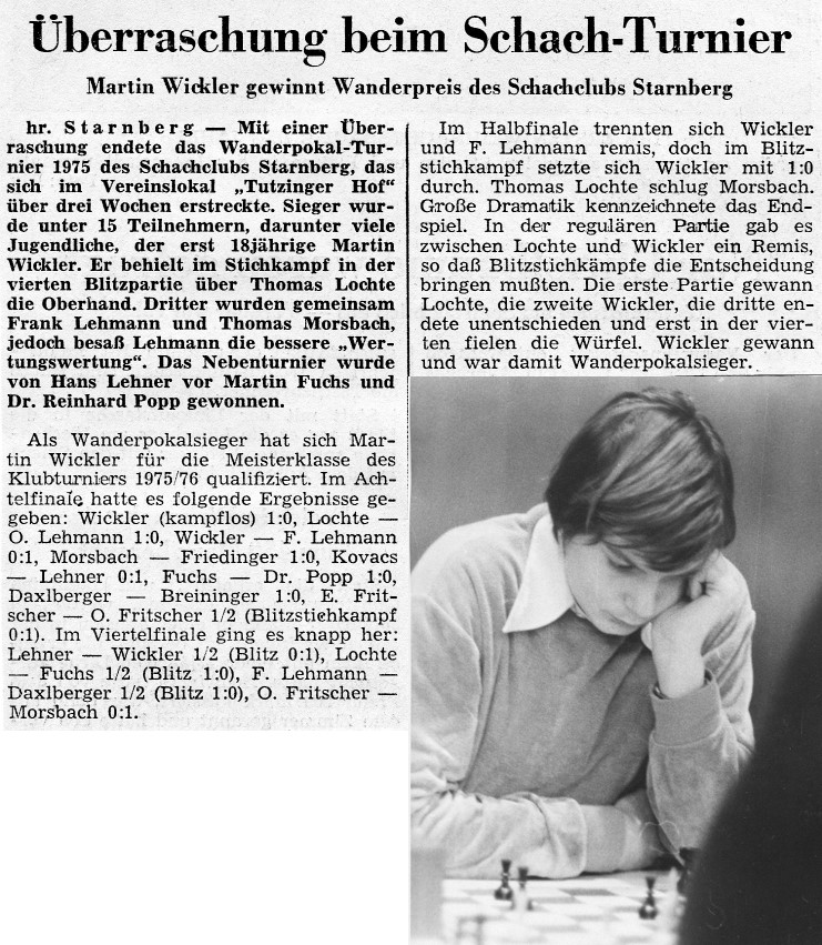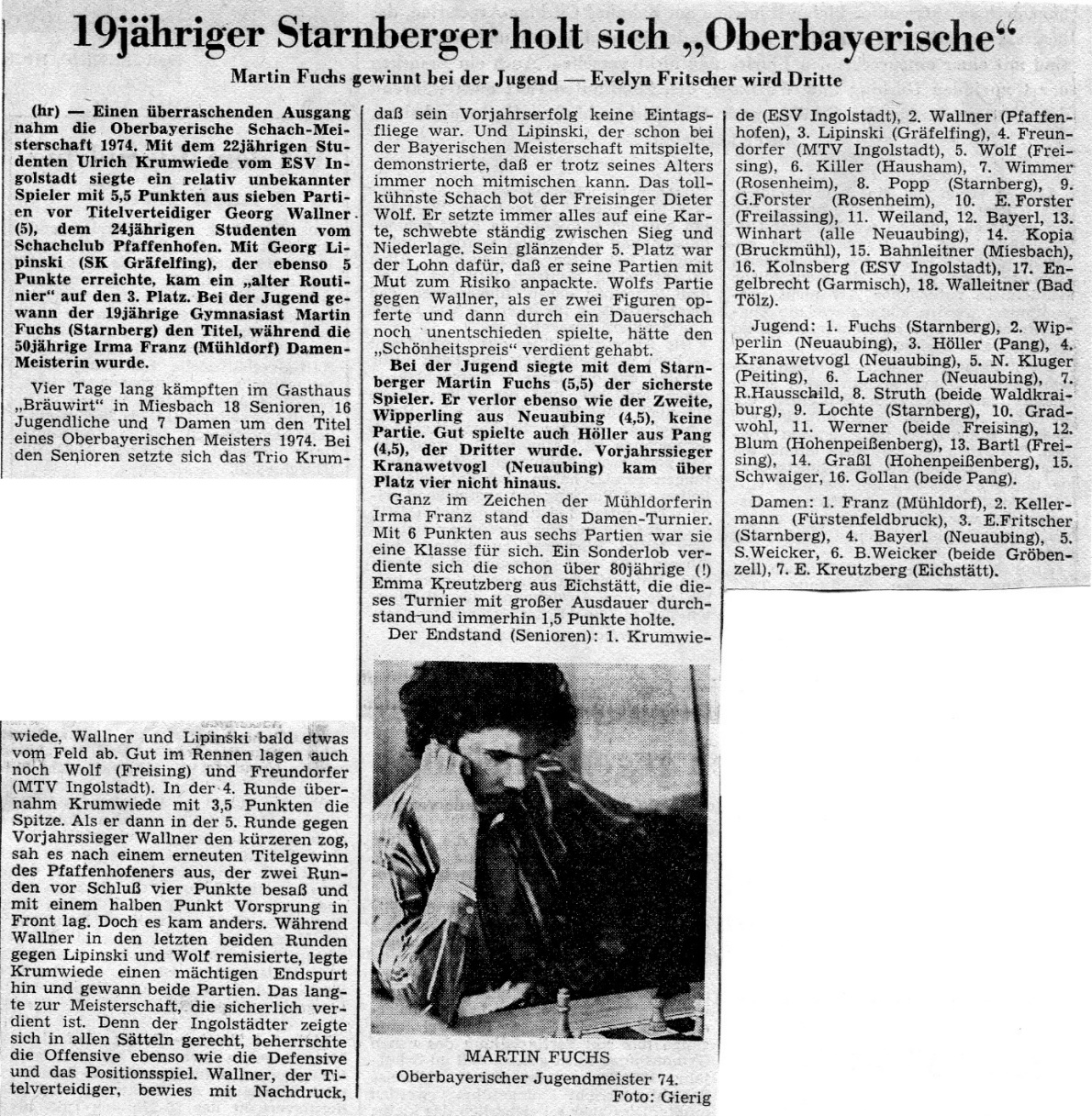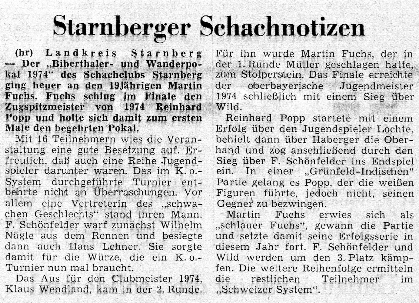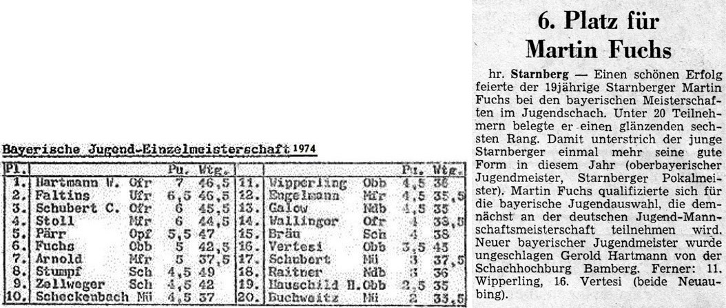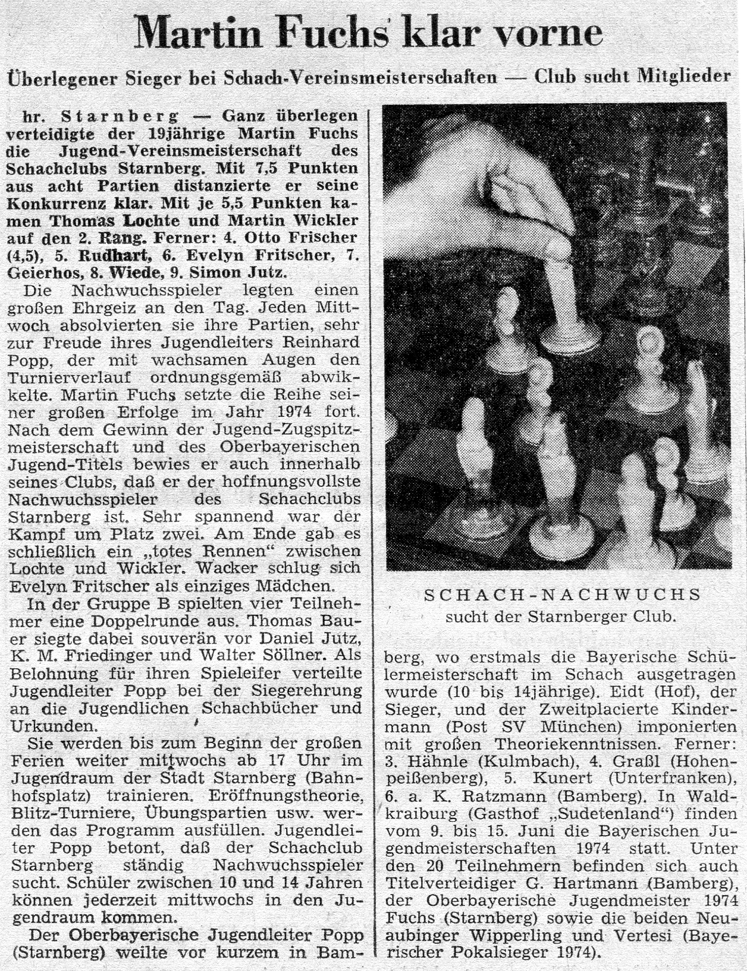 Der spielstärkste Jugendspieler in den Reihen der Kreisstädter war zweifellos Martin Fuchs. Der 17-jährige Schüler gewann 1973 sowohl die zum zweiten Mal ausgetragene Schulschachmeisterschaft am Starnberger Gymnasium als auch die von Jugendleiter Reinhard Popp organisierte Jugend-Klubmeisterschaft. Daneben wurde er – punktgleich mit dem ein Jahr jüngeren Thomas Lochte – im Dezember 1972 Co-Sieger der Junioren-Stadtmeisterschaft. Damit gelang ihm das Kunststück, im selben Jahr sowohl die Stadtmeisterschaft der Senioren als auch der Jugendlichen zu gewinnen. Gerade seinen unerwarteten Titelgewinn bei dem Erwachsenenturnier wollte Fuchs ein Jahr später wiederholen. Doch aufgrund außergewöhnlicher Umstände hatte er dazu keine Gelegenheit.