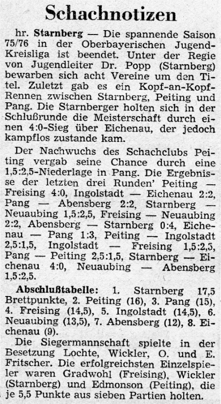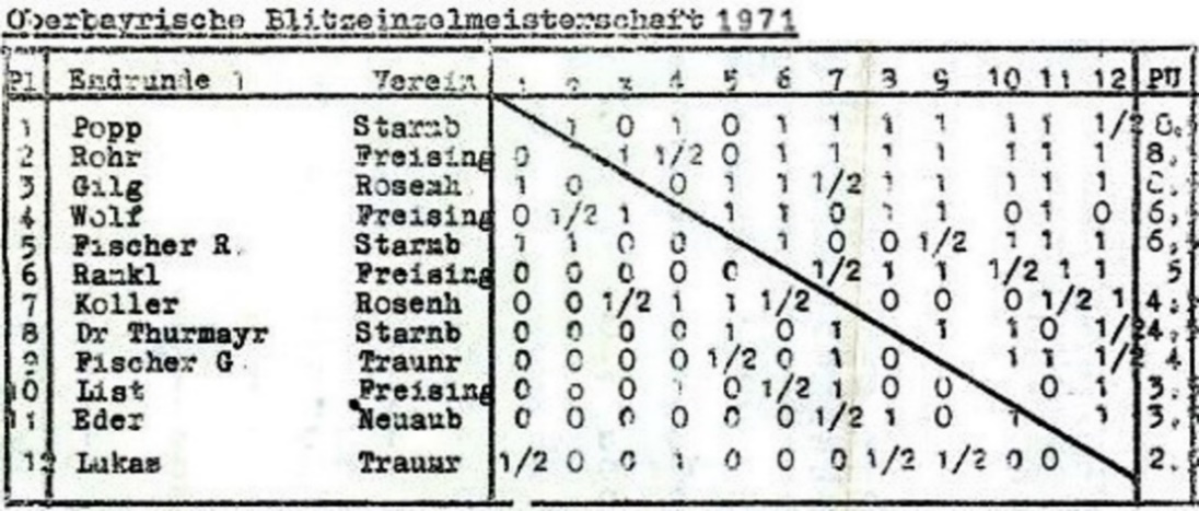 Dieser war in Benediktbeuern aber nicht am Start, und so nutzte Popp die Gunst der Stunde. In der Endrunde I erzielte er 8,5 Zähler aus elf Partien und lag damit punktgleich mit dem Freisinger Spieler Rohr und dem Rosenheimer Karl Gilg an der Spitze. Im Stichkampf setzte er sich schließlich gegen beide Konkurrenten durch und entführte den Titel erstmals in die Kreisstadt. Robert Fischer als Tabellenfünfter und Dr. Alois Thurmayr (Platz 8) rundeten ein starkes Starnberger Mannschaftsergebnis ab.